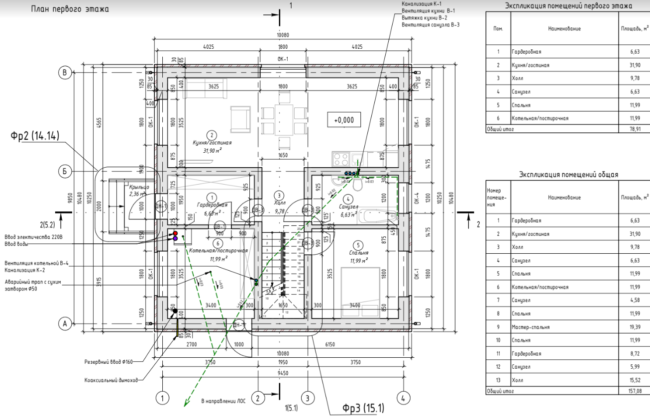 • Общая площадь здания (сумма площадей помещений): 157,08 м2
