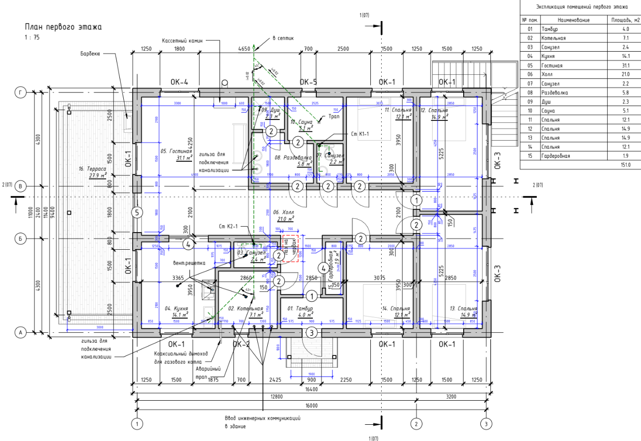 · Общая площадь здания (сумма площадей помещений без террасы и мастерской): 151,0 м2